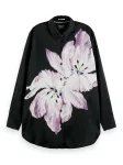 Рубашка оверсайз кроя на пуговицах — главный элемент любой коллекции. Рубашка с длинными рукавами украшена большим изображением тюльпана.